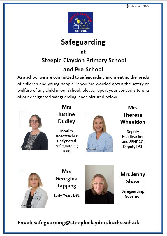 - contact one of the Designated Safeguarding Officers via the school office or email: safeguarding@steepleclaydon.bucks.sch.uk
